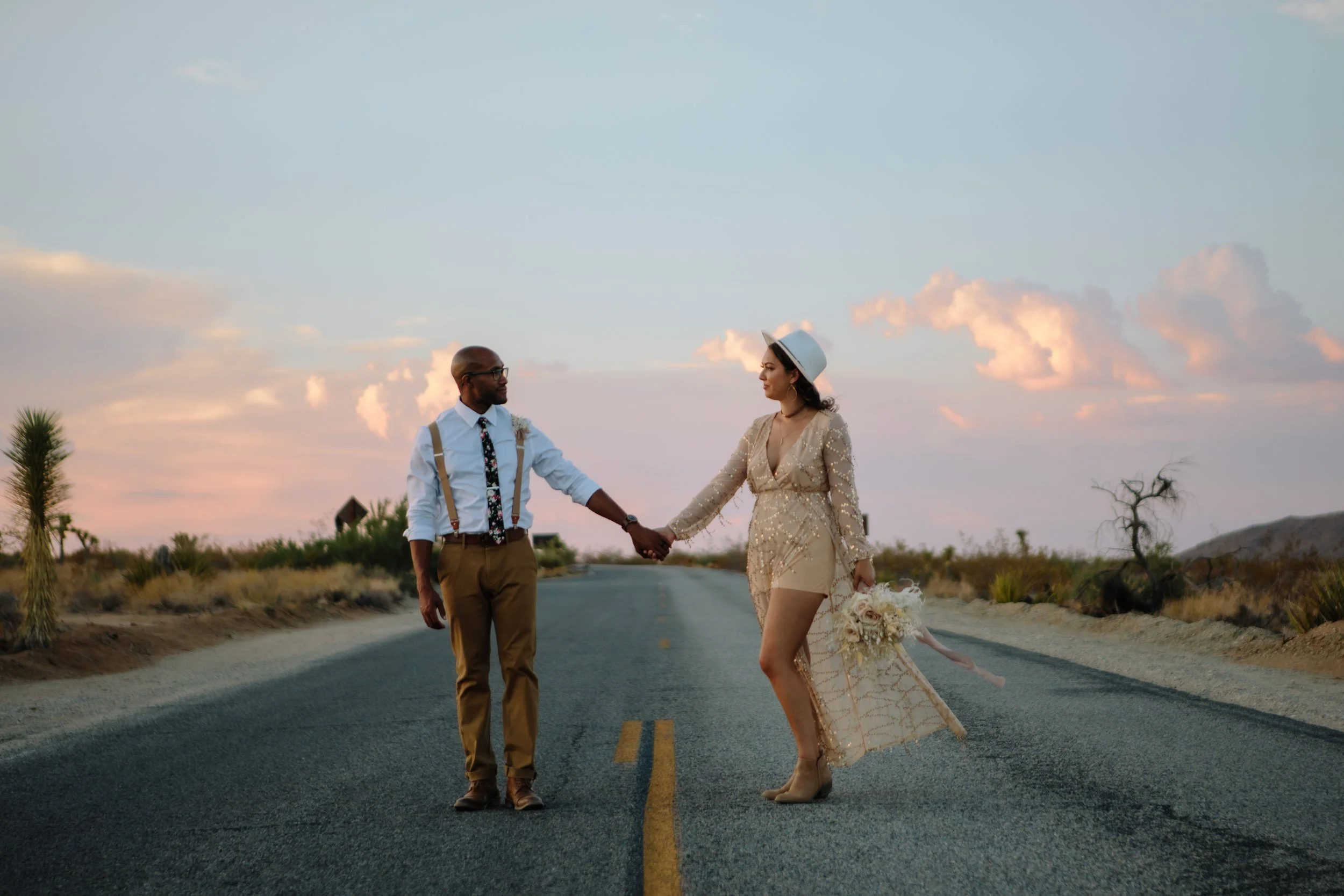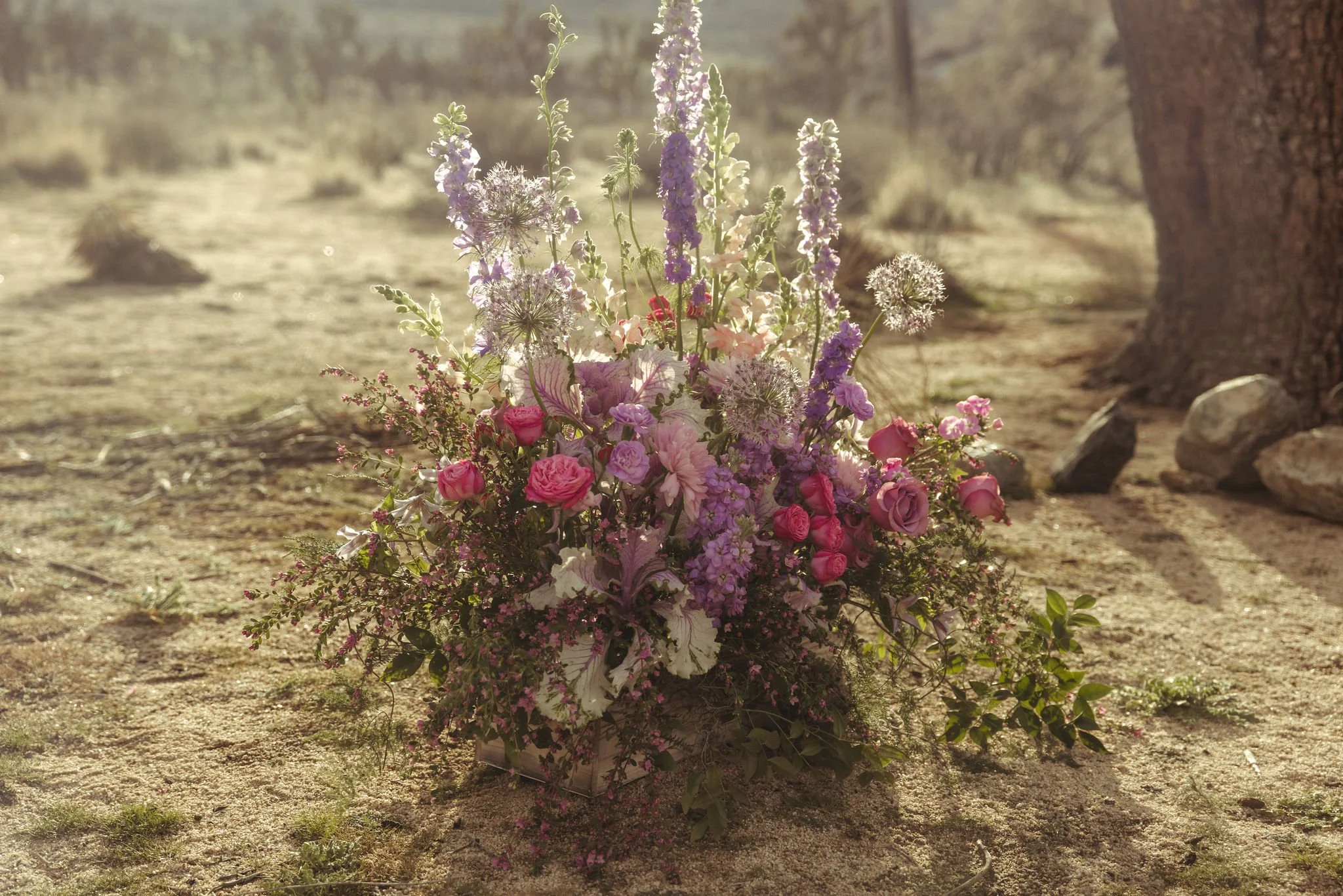 Winter wedding in Joshua Tree National Park. Muted desert backdrop with the ambiance of nature’s prettiest pinks and purple spring flowers.